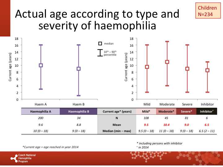 Current age according to type and severity of haemophilia: paediatric patients |
