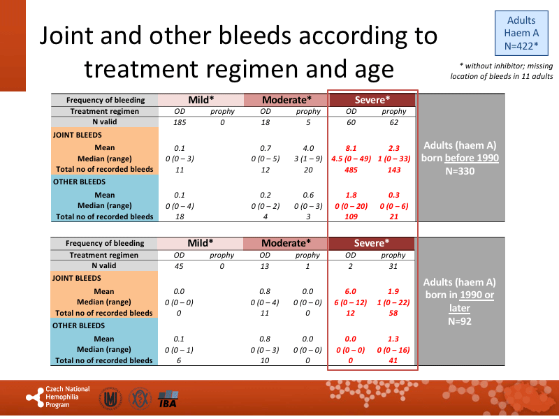 Joint and other bleeds according to treatment regimen and age: adult patients, haemophilia A |