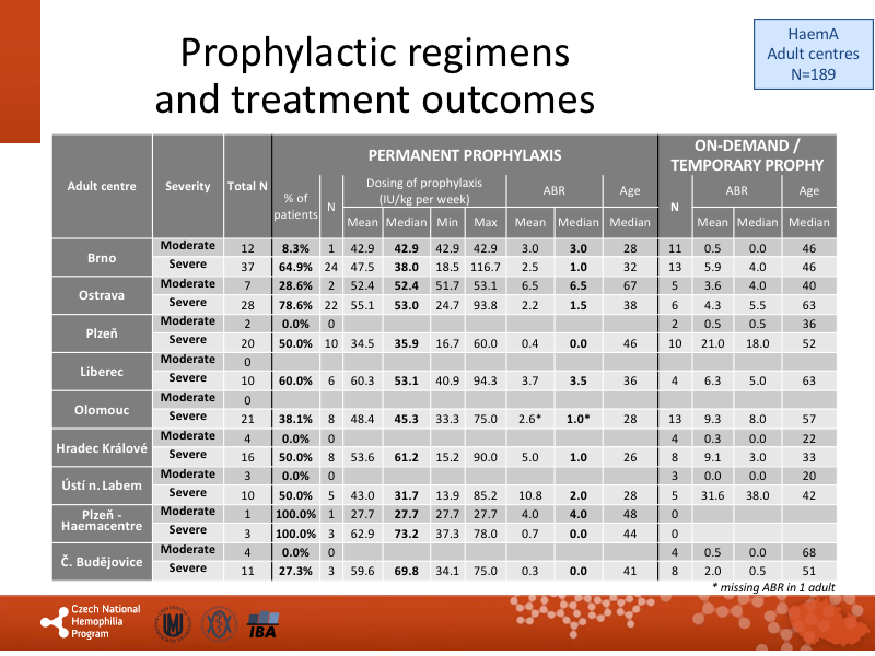 Prophylactic regimens and treatment outcomes: PWHB, adult centres |
