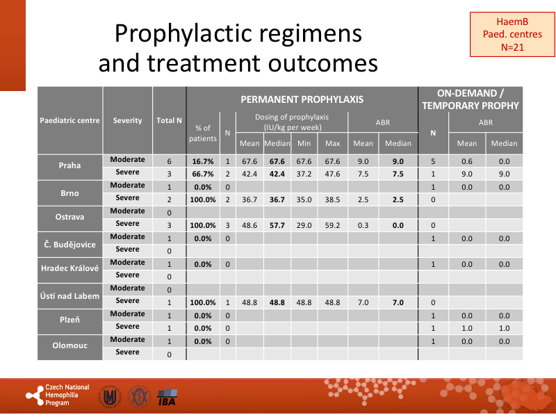 Prophylactic regimens and treatment outcomes: PWHB, paediatric centres |